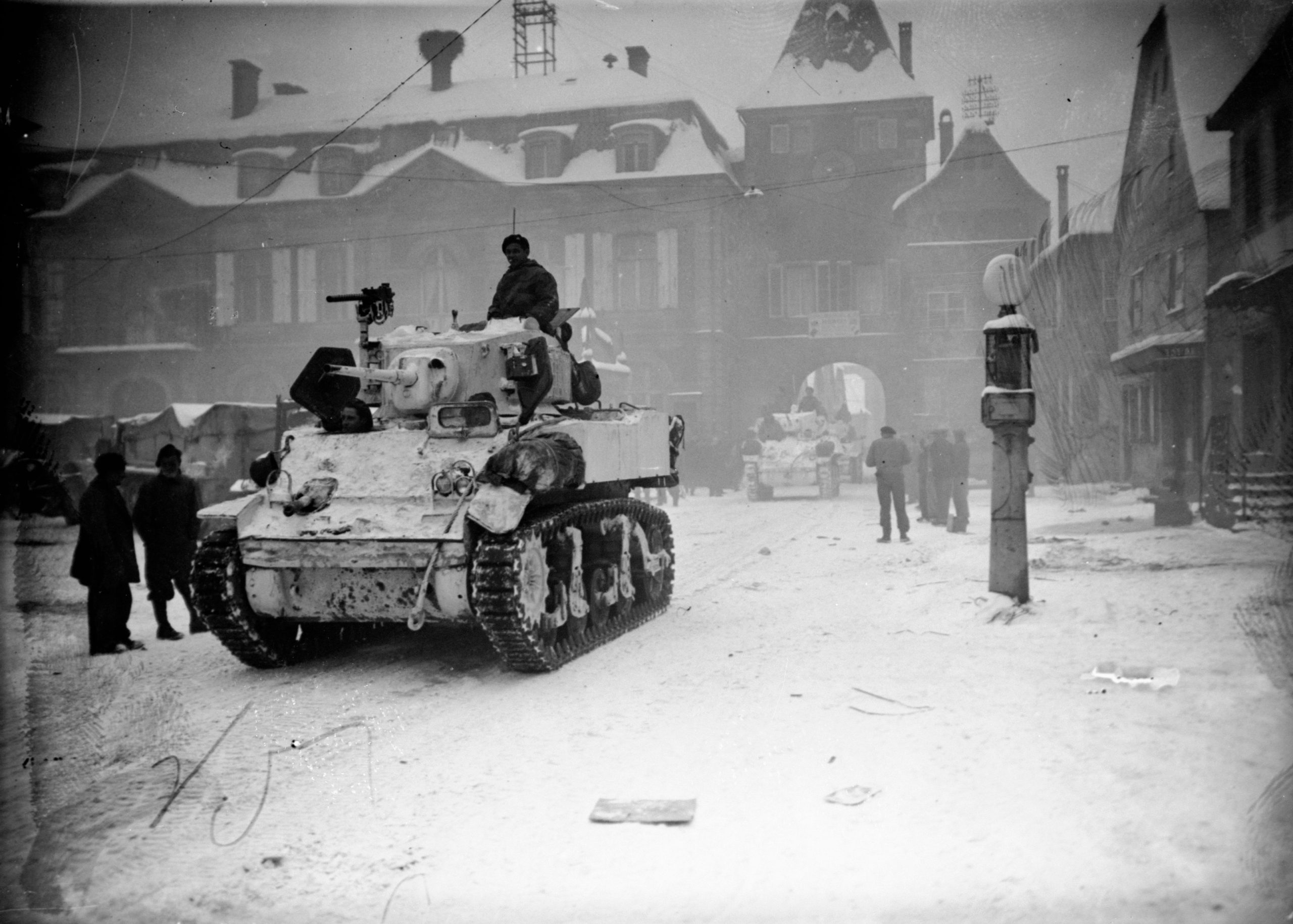 Alors que l’hiver est particulièrement rude comme en témoigne la neige au sol, les chars légers « Stuart » M5A1 de la 2e DB quittent Rosheim pour se diriger vers la zone de combat de la poche de Colmar.